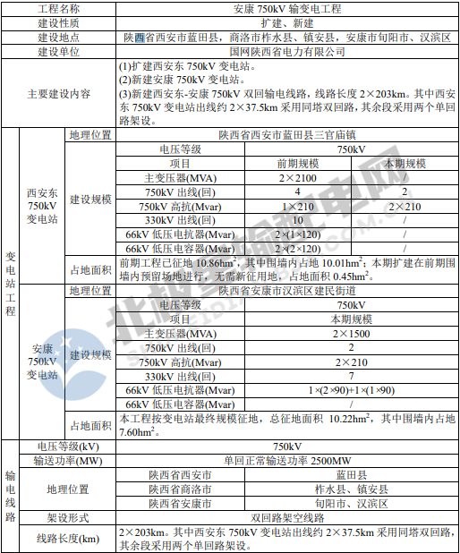 本工程建设内容包括:扩建西安东750kV变电站,新建安康750kV变电站,新建西安东 -安康750kV双回输电线路,工程共涉及1省3地市5县(区、市)。