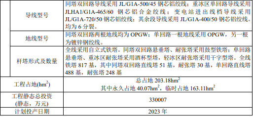本工程同塔双回路导线采用 JL/G1A-500/45 钢芯铝绞线;重冰区单回路导线采用 JLHA1/G1A-465/60 钢芯铝合金绞线;其余段导线采用 JL/G1A-400/50 钢芯铝绞线;变 电站进出线档导线采用 JL/G1A-720/50 钢芯铝绞线。均为 6 分裂。